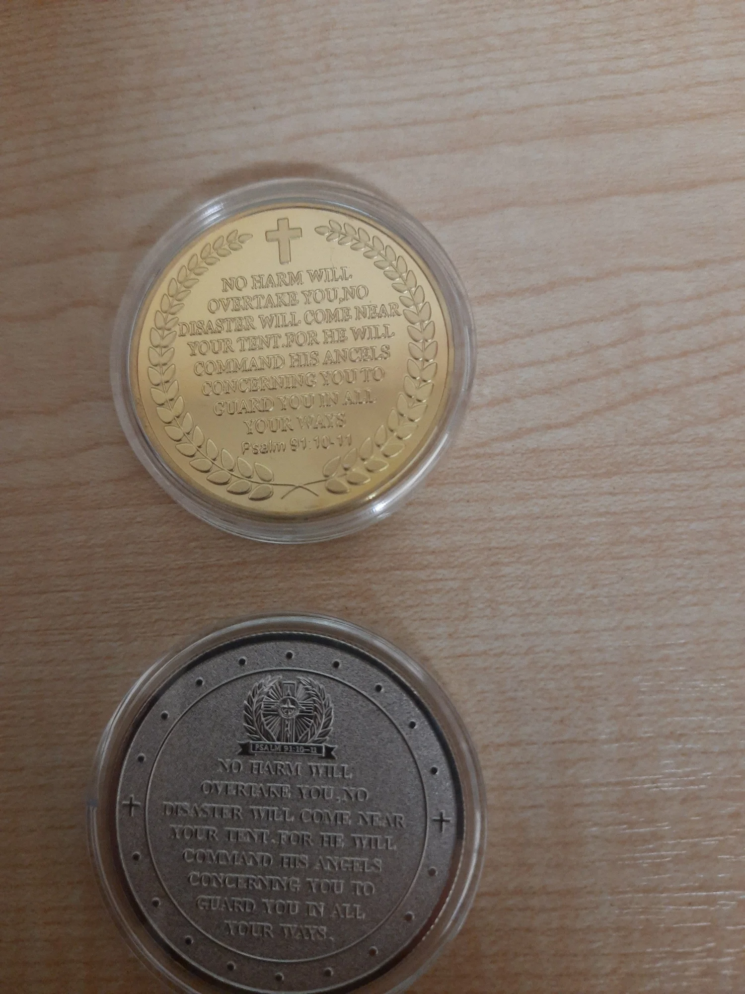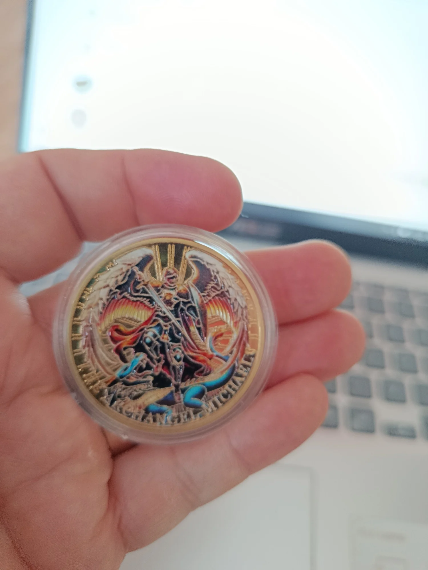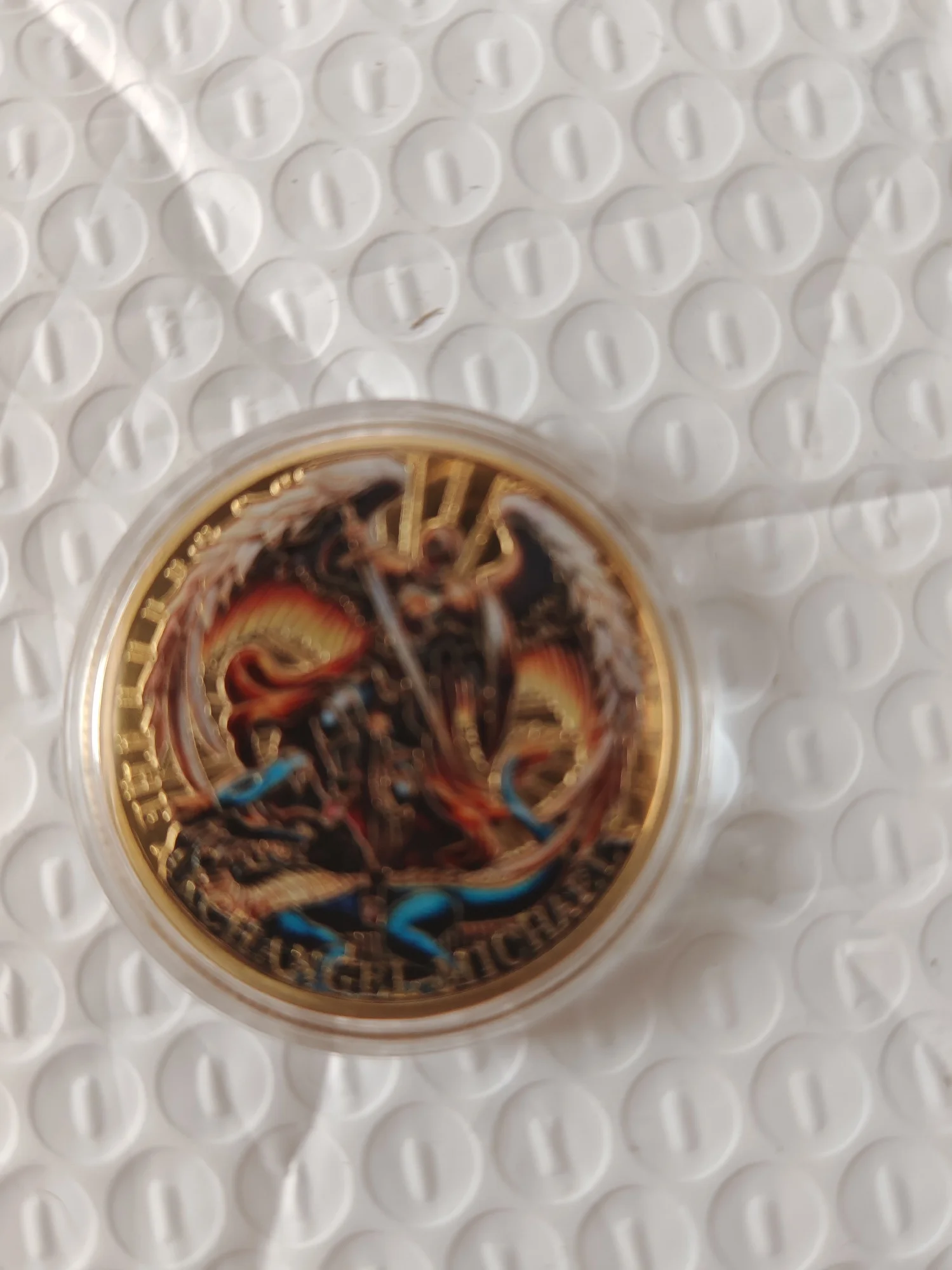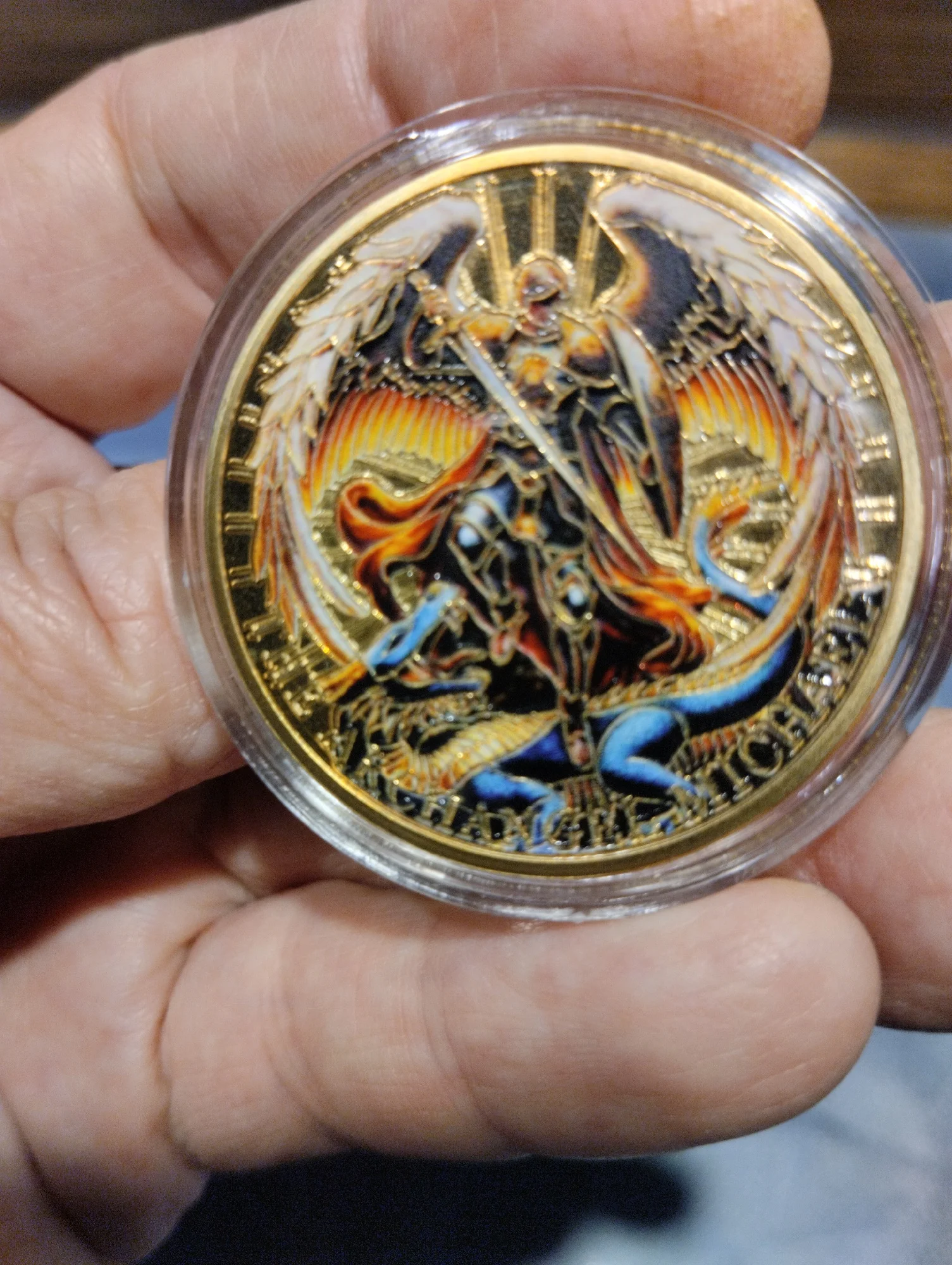 Each coin is beautifully crafted with incredible detail — showing Archangel Michael wielding his sword of justice, standing victorious over evil.